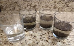 To prepare for the tests, you’ll need to make your dirty water samples. Fill the first cup with plain tap water. This will be the control that the other samples are measured against. Put one dirt sample in each of the remaining cups. Fill the cups halfway with tap water. You need enough water that the dirt can be easily mixed into the water, but avoid filling the cup too much so you don’t splash dirty water everywhere. Once each cup has been mixed, you’ll want to wait about a half hour for the dirt to settle to the bottom.