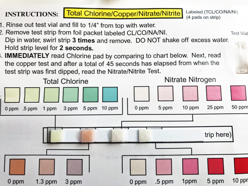 This time you are going to test for Chlorine and Copper and Nitrate and Nitrite (not to be confused with Nitrate; note the “ate” and the “ite” at the end of the word”… Sounds like this… “I ate an entire pizza last night”). So you have Nitrate and Nitrite.