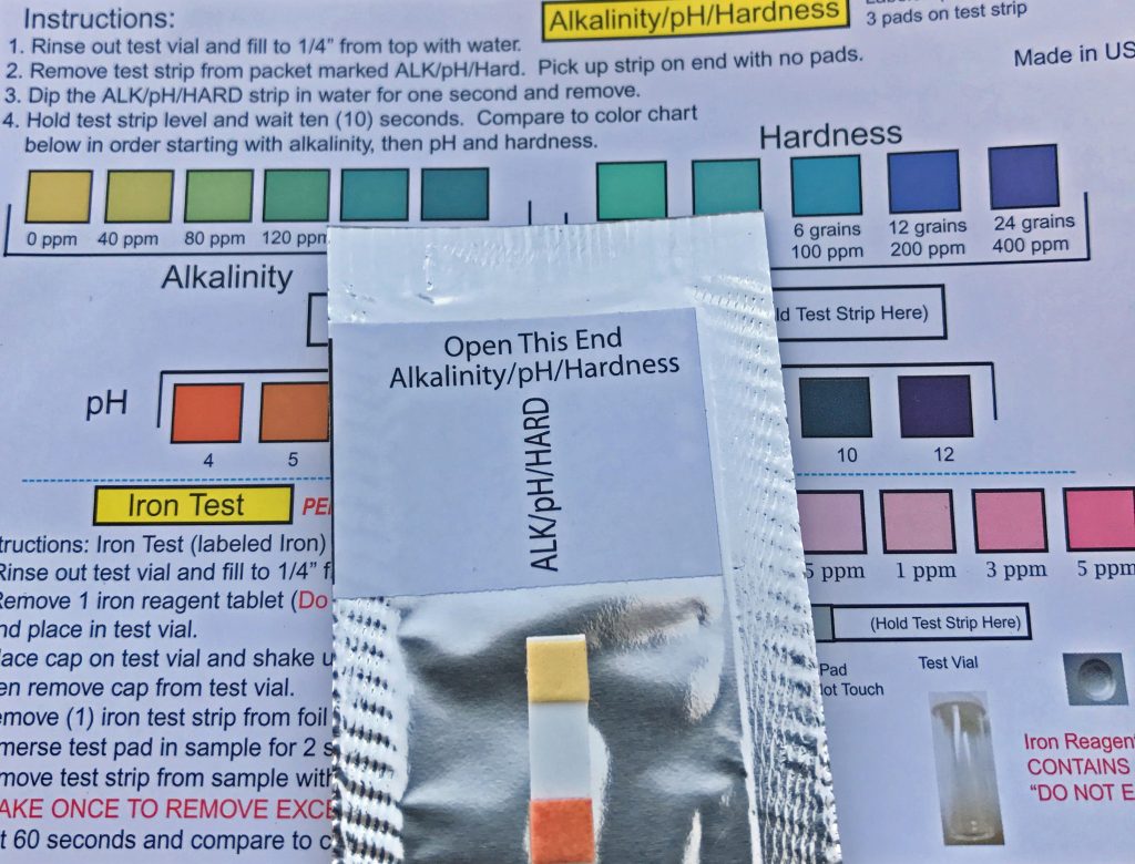 The first test we are going to do with your water testing kit is to check your Alkalinity / Hardness / pH. You are going to carefully open the foil wrapper, which contains a test strip. It is labeled Alkalinity on the package.
